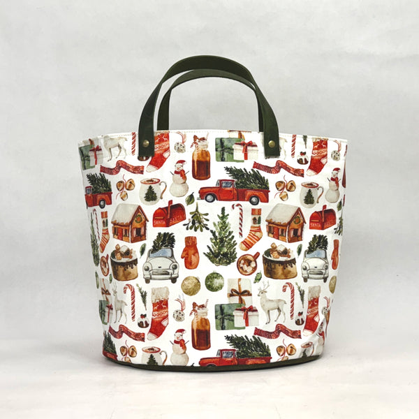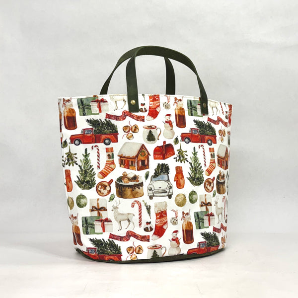 The bag is made with medium weight cotton twill in HipKid Design's Christmas Stories print with a heavy waxed canvas (water resistant) bottom. It is fully lined with a heavy cotton canvas. The bag has a layer of heavy interfacing which gives the bag structure. There are 2 interior pockets to keep notions or other smaller items separate. The short leather handles completes the simplicity of the bag.