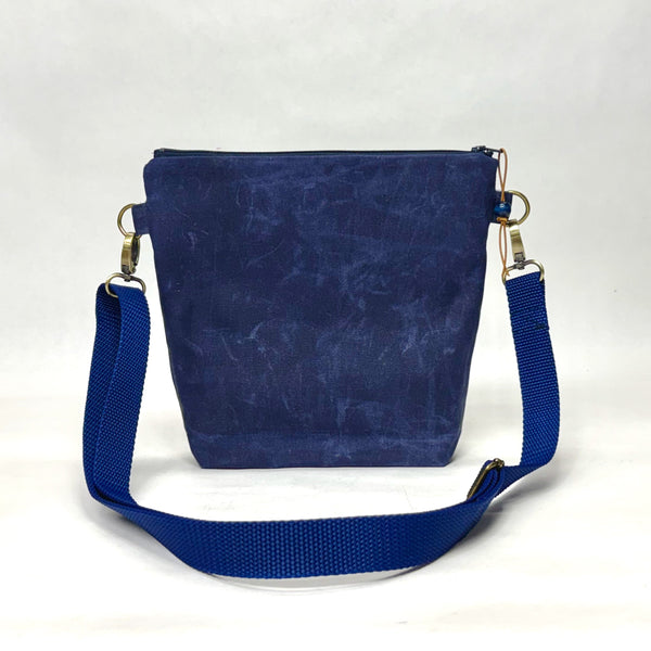 The bag is made with a solid waxed canvas accented on one side with Anna Graham's Forage print in blue for the 2 exterior pockets.  It is fully lined with a sturdy weight cotton canvas and an interior pocket.  There is a zipper closure at the top and a detachable adjustable webbing strap long enough as cross body strap.