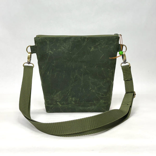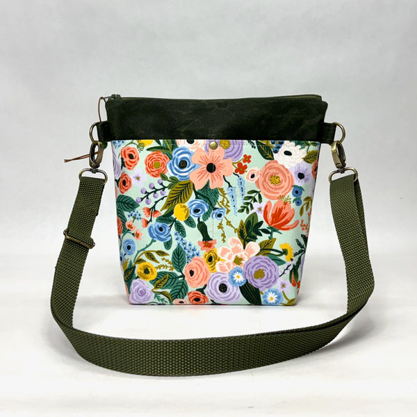The bag is made with a solid waxed canvas accented on one side with Rifle Paper Co's Garden Party print in mint for the 2 exterior pockets. It is fully lined with a sturdy weight cotton canvas and an interior pocket. There is a zipper closure at the top and a detachable adjustable webbing strap long enough as cross body strap.