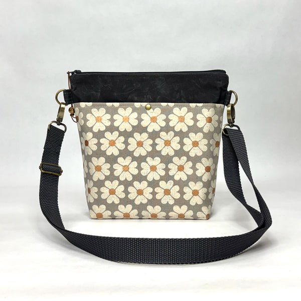 The bag is made with a solid waxed canvas accented on one side with Jen Hewett's Heart Flower print in grey for the 2 exterior pockets. It is fully lined with a sturdy weight cotton canvas and an interior pocket. There is a zipper closure at the top and a detachable adjustable webbing strap long enough as cross body strap.