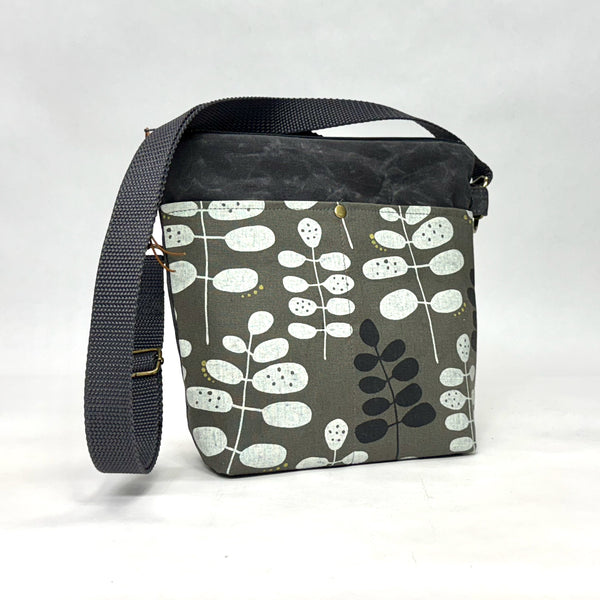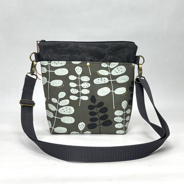 The bag is made with a solid waxed canvas accented on one side with Anna Graham's Leaves print in pepper for the 2 exterior pockets. It is fully lined with a sturdy weight cotton canvas and an interior pocket. There is a zipper closure at the top and a detachable adjustable webbing strap long enough as cross body strap.