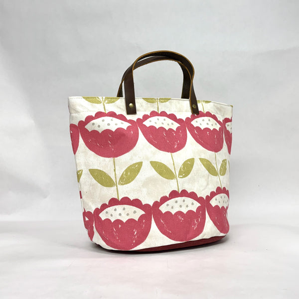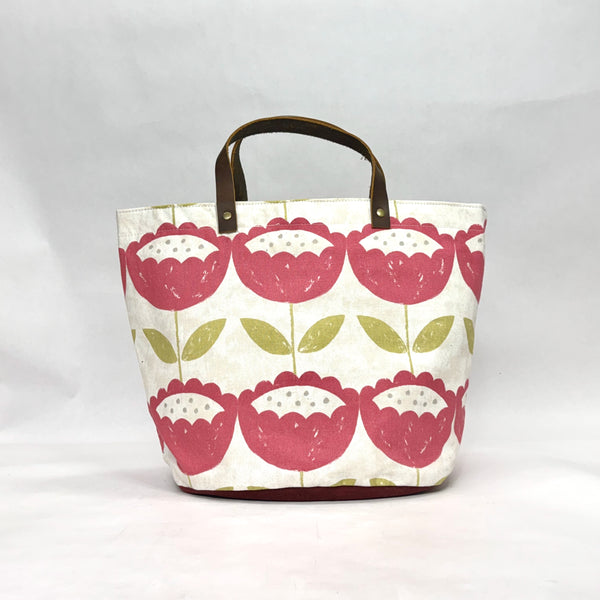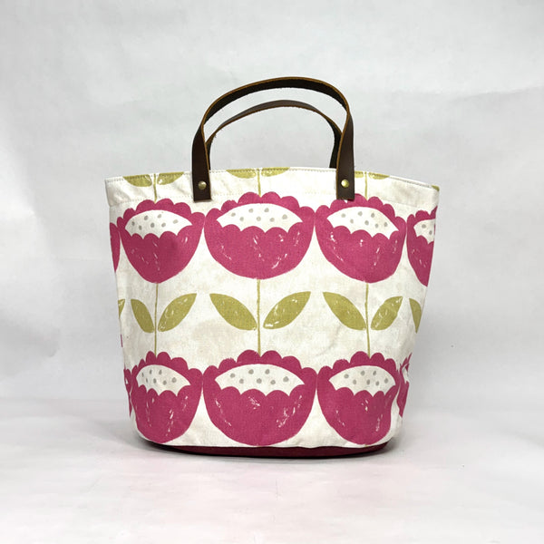 The bag is made with Clarke & Clarke's medium weight cotton Anais print and has a heavy waxed canvas (water resistant) bottom. It is fully lined with a heavy cotton canvas. The bag has a layer of heavy interfacing which gives the bag structure. There are 2 interior pockets to keep notions or other smaller items separate. The short leather handles completes the simplicity of the bag.