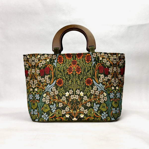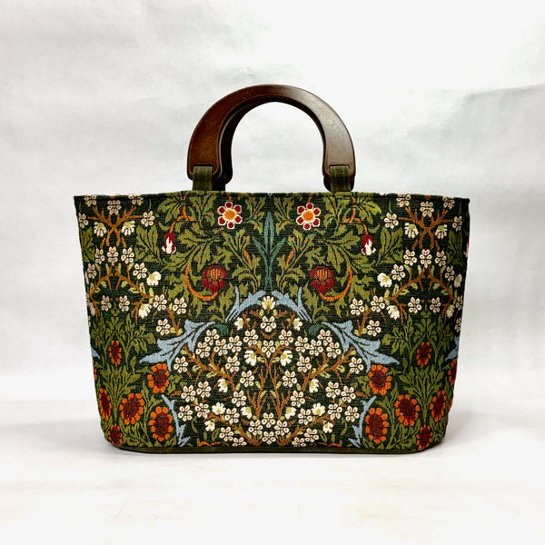 The bag is made with a William Morris' upholstery weight fabric in his Blackthorne design in green and has a heavy waxed canvas (water resistant) bottom. It is fully lined with a heavy cotton canvas. The bag has a layer of heavy interfacing which gives the bag added structure. There are 3 interior pockets to keep notions or other smaller items separate. The composite wooden handles give the bag some vintage vibe.
