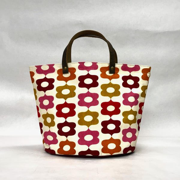 The bag is made with Jessica Jone's 100% cotton Calliope print and has a heavy waxed canvas (water resistant) bottom. It is fully lined with a heavy cotton canvas. The bag has a layer of heavy interfacing which gives the bag structure. There are 2 interior pockets to keep notions or other smaller items separate. The short leather handles completes the simplicity of the bag.