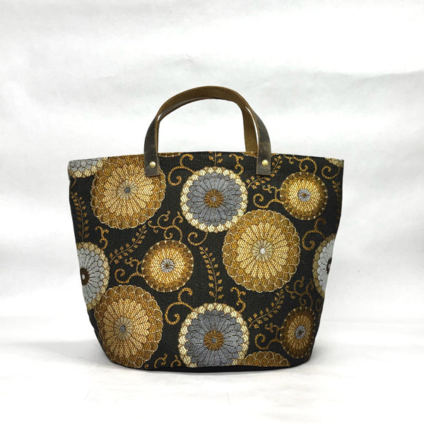 The bag is made with an upholstery weight Circle Flowers design in brown and has a heavy waxed canvas (water resistant) bottom. It is fully lined with a heavy cotton canvas. The bag has a layer of heavy interfacing which gives the bag structure. There are 2 interior pockets to keep notions or other smaller items separate. The short leather handles completes the simplicity of the bag.