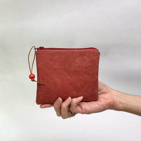 This simple zipper pouch will fit your small gadgets, coins, credit cards or cosmetics needs and is just the right size to tuck into your purse. It is made with Rifle Paper Co.'s decorator weight Juliet print in burgundy and fully lined with a lightweight cotton canvas. It has a thin layer of fleece for padding/durability and zipper closure with a leather cord and wooden bead pull tab. Zipper color might vary on each pouch but will be coordinated with the print.