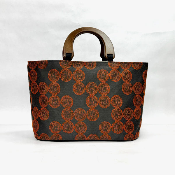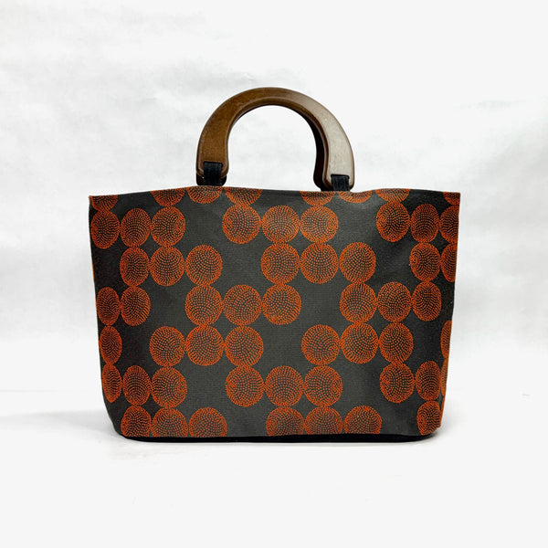 The bag is made with an upholstery weight fabric in a Dottie design and has a heavy waxed canvas (water resistant) bottom. It is fully lined with a heavy cotton canvas. The bag has a layer of heavy interfacing which gives the bag added structure. There are 3 interior pockets to keep notions or other smaller items separate. The composite wooden handles give the bag some vintage vibe.