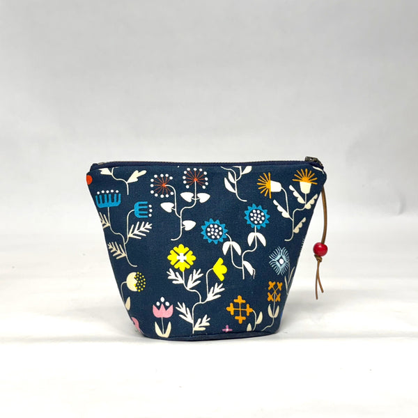 The pouch is made with Rashida Coleman Hale's cotton/linen Forget Me Not print in navy and is fully lined with natural color cotton canvas. There is a layer of fleece between the lining and the outer fabric to give it a bit of padding and structure. It has a metal zipper closure with a wooden bead and leather lace pull tab.