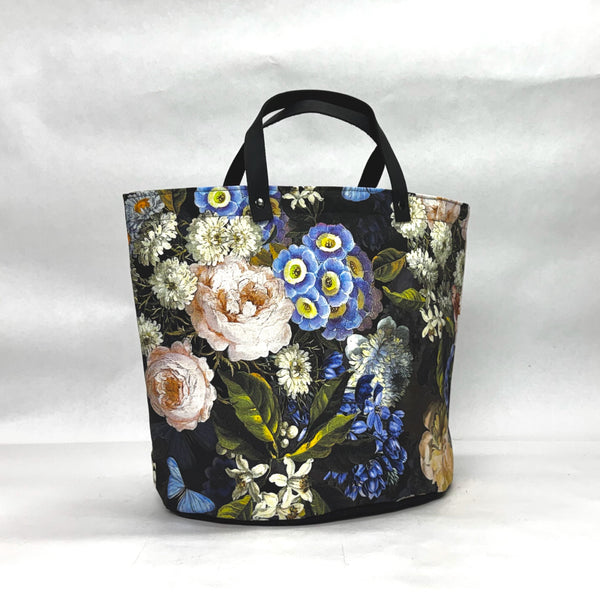 The bag is made with Uta Naumann's cotton twill Grandmillennial print in vintage dark and has a heavy waxed canvas (water resistant) bottom. It is fully lined with a heavy cotton canvas. The bag has a layer of heavy interfacing which gives the bag structure. There are 2 interior pockets to keep notions or other smaller items separate. The short leather handles completes the simplicity of the bag.