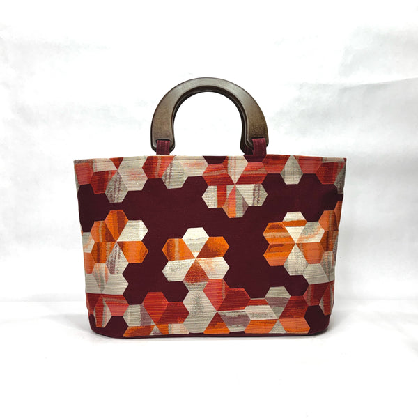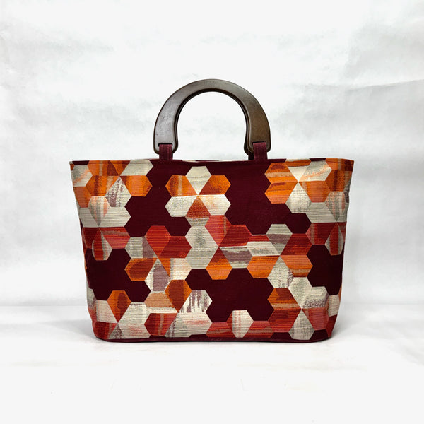 The bag is made with an upholstery weight Hexi design fabric in shades of burgandy and sienna and has a heavy waxed canvas (water resistant) bottom. It is fully lined with a heavy cotton canvas. The bag has a layer of heavy interfacing which gives the bag added structure. There are 3 interior pockets to keep notions or other smaller items separate. The composite wooden handles give the bag some vintage vibe.