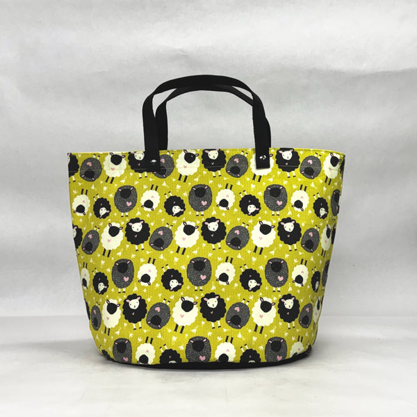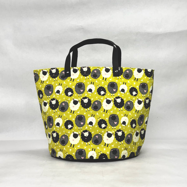 The bag is made with an Patty Rybolt's 100% cotton twill Itsy Bitsy Ditsy Sheep print and has a heavy waxed canvas (water resistant) bottom. It is fully lined with a heavy cotton canvas. The bag has a layer of heavy interfacing which gives the bag structure. There are 2 interior pockets to keep notions or other smaller items separate. The short leather handles completes the simplicity of the bag.