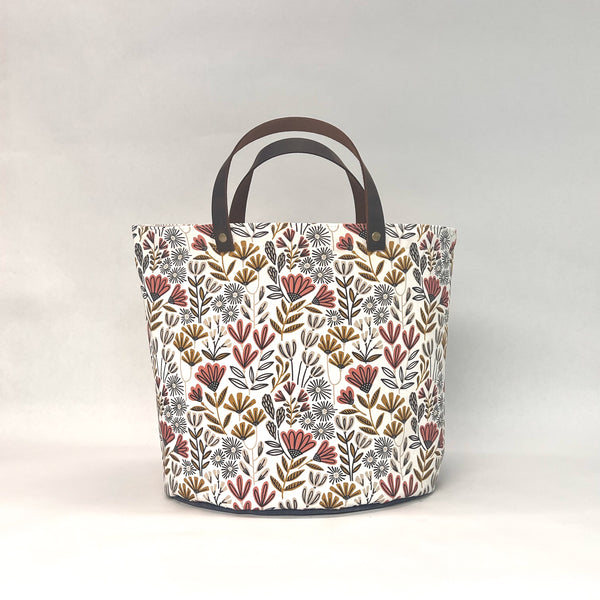 The bag is made with Amy MacCready's medium weight cotton canvas Jillian print in pink and has a heavy waxed canvas (water resistant) bottom. It is fully lined with a heavy cotton canvas. The bag has a layer of heavy interfacing which gives the bag structure. There are 2 interior pockets to keep notions or other smaller items separate. The short leather handles completes the simplicity of the bag.