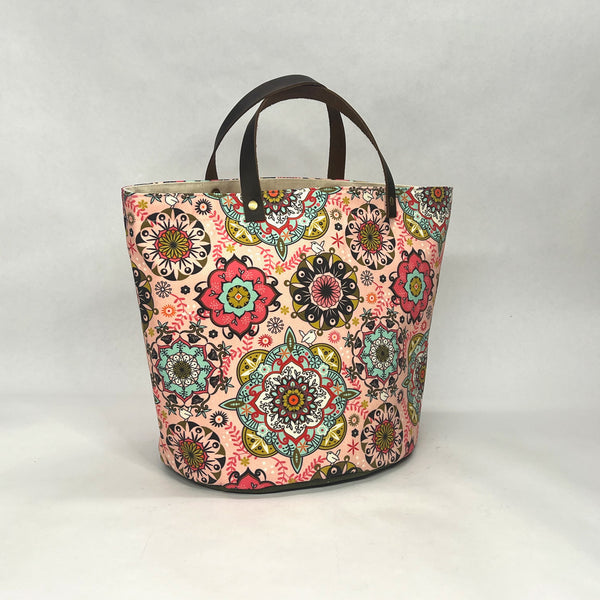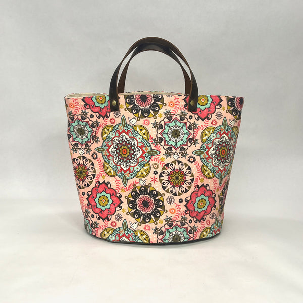 The bag is made with Camilla Lab's cotton canvas Mandala print in pink and has a heavy waxed canvas (water resistant) bottom. It is fully lined with a heavy cotton canvas. The bag has a layer of heavy interfacing which gives the bag structure. There are 2 interior pockets to keep notions or other smaller items separate. The short leather handles completes the simplicity of the bag.