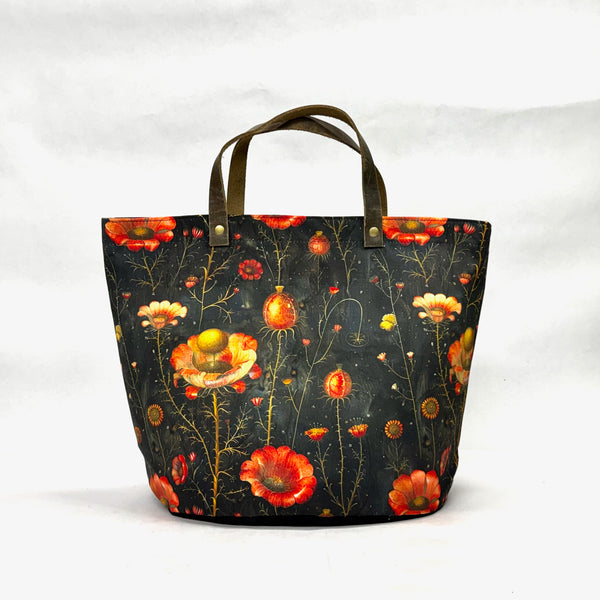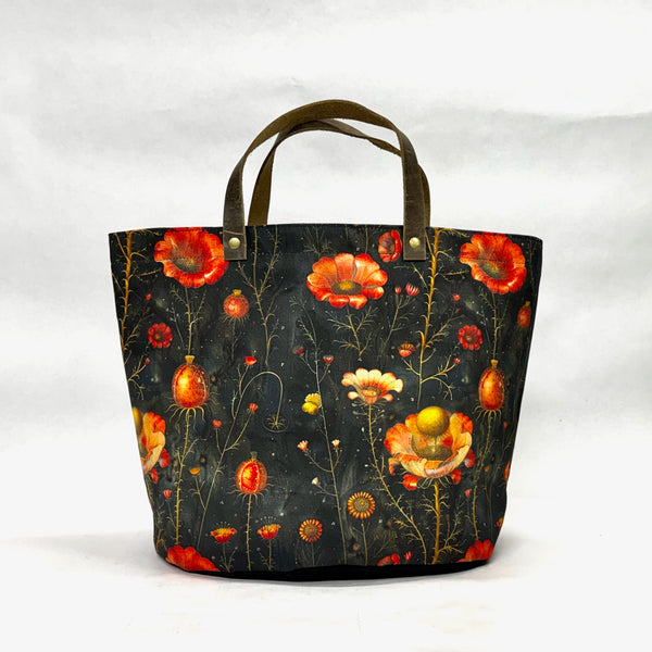 The bag is made with Nickleen Mosher's cotton twill Medieval Flowers print and has a heavy waxed canvas (water resistant) bottom. It is fully lined with a heavy cotton canvas. The bag has a layer of heavy interfacing which gives the bag structure. There are 2 interior pockets to keep notions or other smaller items separate. The short leather handles completes the simplicity of the bag.