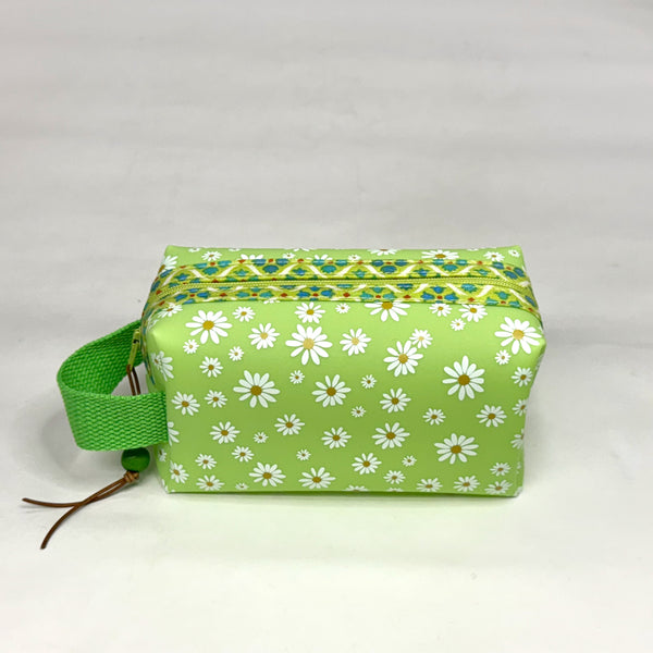 This unlined pouch is made with a daisy print jelly vinyl in matte finish mint and trimmed with a coordinating cotton edge at the opening. It has a webbing side handle. The sturdiness of the jelly vinyl gives the bag a bit of structure. It has a zipper closure with a wooden bead and leather lace pull tab.