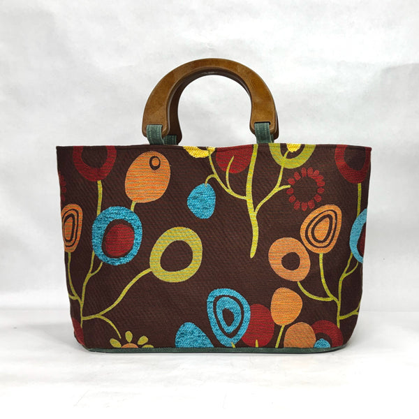 The bag is made with an upholstery weight Mod Pod design in brown and has a heavy waxed canvas (water resistant) bottom. It is fully lined with a heavy cotton canvas. The bag has a layer of heavy interfacing which gives the bag added structure. There are 3 interior pockets to keep notions or other smaller items separate. The composite wooden handles give the bag some vintage vibe.