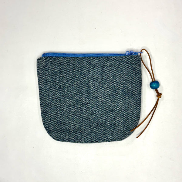 This simple round pouch will fit your small gadgets, coins, credit cards or cosmetics needs and is just the right size to tuck into your purse. It is made with a muted teal herringbone wool and fully lined with a cotton print. It has a thin layer of interfacing durability and a zipper closure with a leather and wood bead pull.