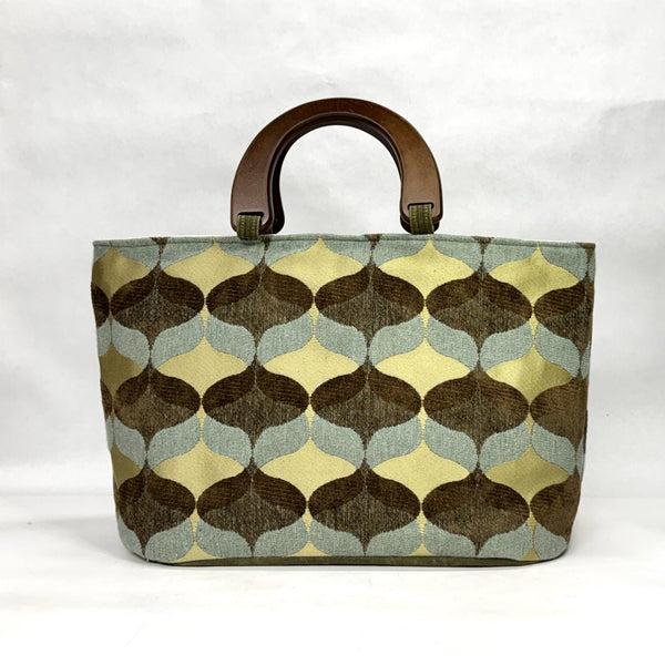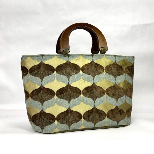 The bag is made with a chenille upholstery weight fabric in an Ogee design and has a heavy waxed canvas (water resistant) bottom. It is fully lined with a heavy cotton canvas. The bag has a layer of heavy interfacing which gives the bag added structure. There are 3 interior pockets to keep notions or other smaller items separate. The composite wooden handles give the bag some vintage vibe.