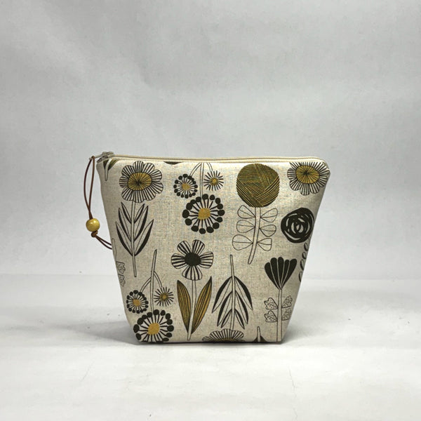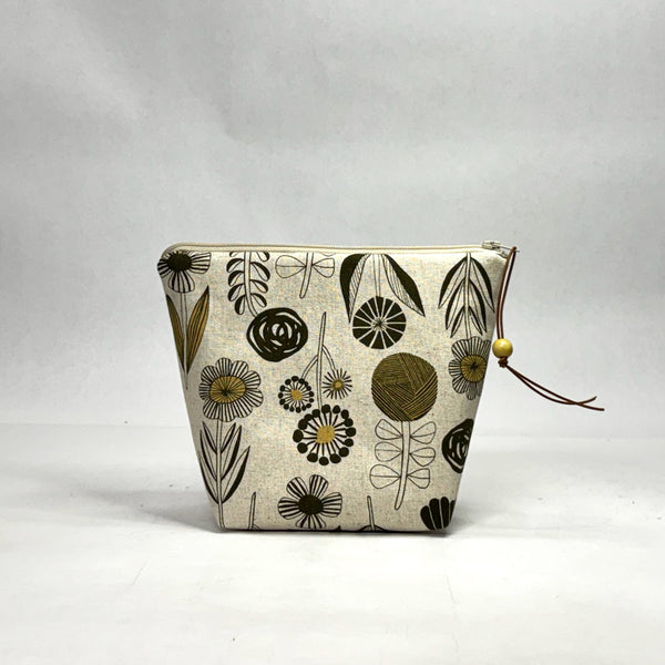 The pouch is made with a cotton / linen fabric in a Flowers print and is fully lined with light grey twill. There is a layer of thin fleece in between the layers to give it a bit of structure. It has a zipper closure with a wooden bead and leather lace pull tab.