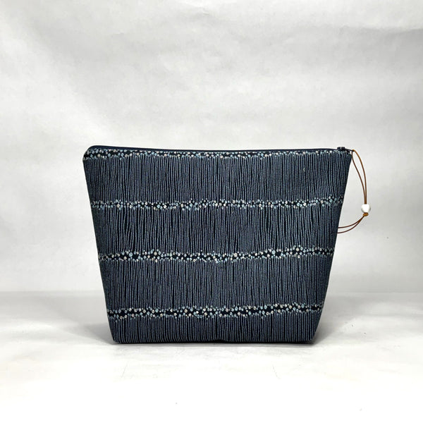 The pouch is made with a upholstery weight Multi Sticks design and is fully lined with light grey twill. There is a layer of thin fleece in between the layers to give it a bit of structure. It has a zipper closure with a wooden bead and leather lace pull tab.