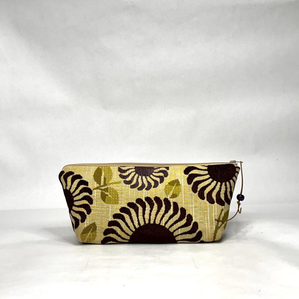 The pouch is made with a upholstery weight chenille fabric in a purple flowers design and is fully lined with light grey twill. There is a layer of thin fleece in between the layers to give it a bit of structure. It has a zipper closure with a wooden bead and leather lace pull tab.
