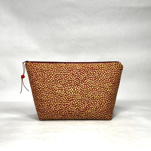 The pouch is made with a upholstery weight chenille fabric in a Scattered Dots design and is fully lined with light grey twill. There is a layer of thin fleece in between the layers to give it a bit of structure. It has a zipper closure with a wooden bead and leather lace pull tab.