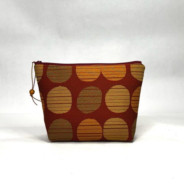 The pouch is made with a upholstery weight Striped Dots design and is fully lined with light grey twill. There is a layer of thin fleece in between the layers to give it a bit of structure. It has a zipper closure with a wooden bead and leather lace pull tab.