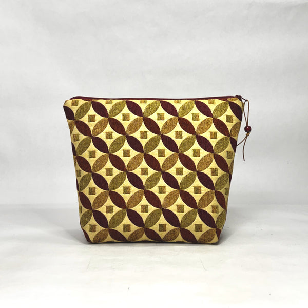 The pouch is made with a upholstery weight chenille fabric in a venn design and is fully lined with light grey twill. There is a layer of thin fleece in between the layers to give it a bit of structure. It has a zipper closure with a wooden bead and leather lace pull tab.