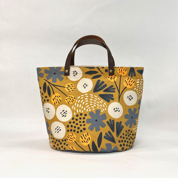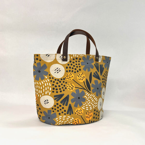 The bag is made with Amy MacCready's medium weight cotton canvas Phyllis print in dijon and has a heavy waxed canvas (water resistant) bottom.  It is fully lined with a heavy cotton canvas. The bag has a layer of heavy interfacing which gives the bag structure. There are 2 interior pockets to keep notions or other smaller items separate.  The short leather handles completes the simplicity of the bag.