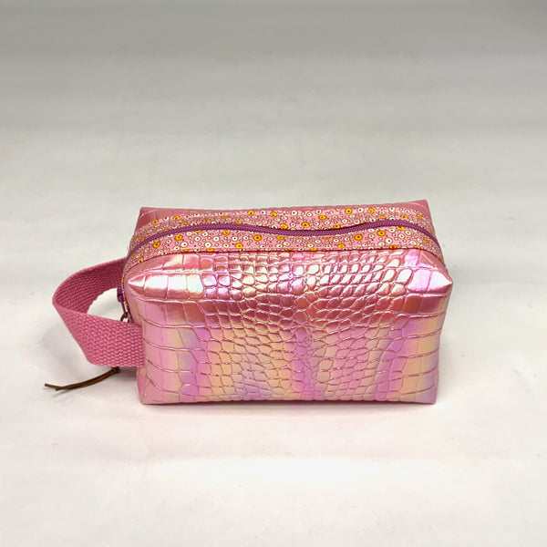 This unlined pouch is made with a croc imprint polyurethane in a pink iridescent finish and trimmed with a coordinating cotton edge at the opening. It has a webbing side handle. The sturdiness of the polyurethane material gives the bag a bit of structure. It has a zipper closure with a wooden bead and leather lace pull tab.