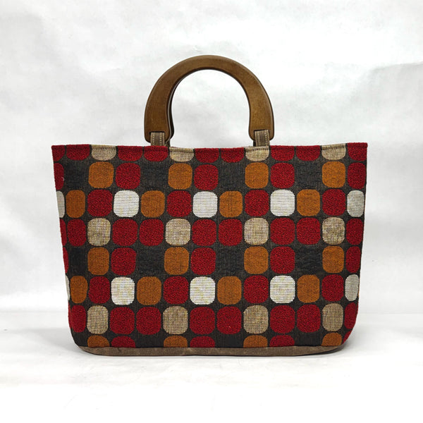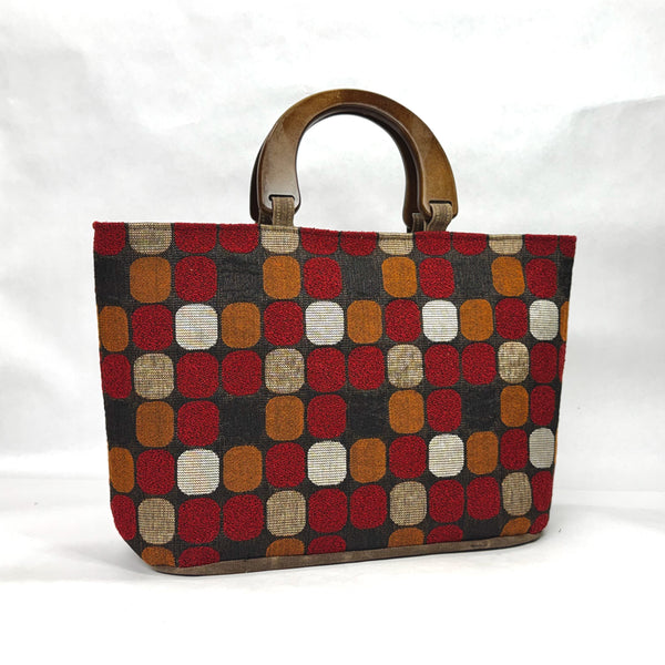 The bag is made with an upholstery weight Chroma design fabric in red and has a heavy waxed canvas (water resistant) bottom. It is fully lined with a heavy cotton canvas. The bag has a layer of heavy interfacing which gives the bag added structure. There are 3 interior pockets to keep notions or other smaller items separate. The composite wooden handles give the bag some vintage vibe.