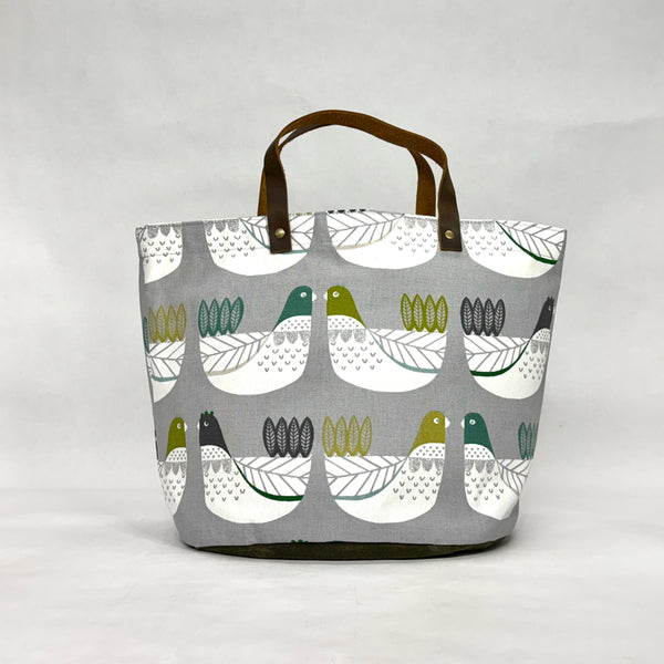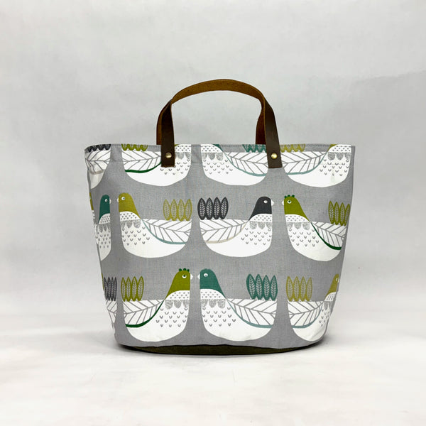 The bag is made with iLiv's Scandinavian Chicken print in kiwi and has a heavy waxed canvas (water resistant) bottom.  It is fully lined with a heavy cotton canvas. The bag has a layer of heavy interfacing which gives the bag structure. There are 2 interior pockets to keep notions or other smaller items separate.  The short leather handles completes the simplicity of the bag.