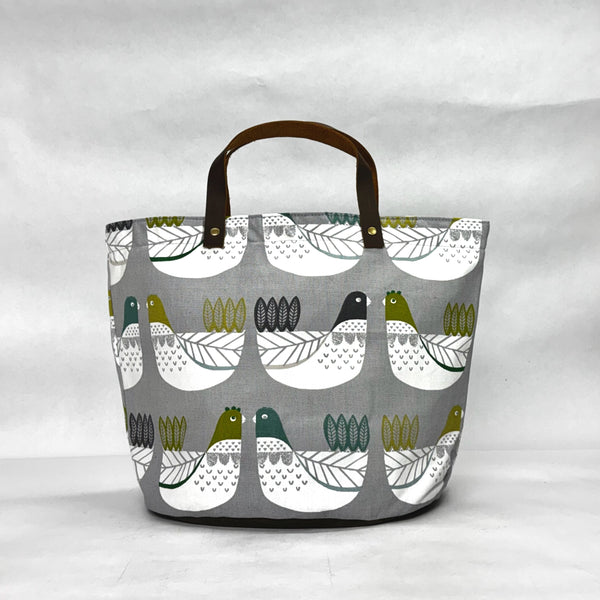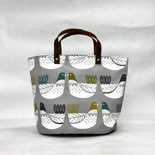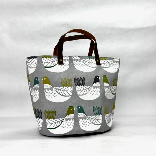 The bag is made with iLiv's Scandinavian Chicken print in kiwi and has a heavy waxed canvas (water resistant) bottom. It is fully lined with a heavy cotton canvas. The bag has a layer of heavy interfacing which gives the bag structure. There are 2 interior pockets to keep notions or other smaller items separate. The short leather handles completes the simplicity of the bag.
