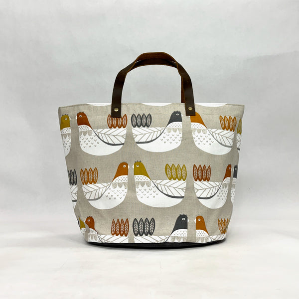 The bag is made with iLiv's Scandinavian Chicken print in tangerine and has a heavy waxed canvas (water resistant) bottom. It is fully lined with a heavy cotton canvas. The bag has a layer of heavy interfacing which gives the bag structure. There are 2 interior pockets to keep notions or other smaller items separate. The short leather handles completes the simplicity of the bag.
