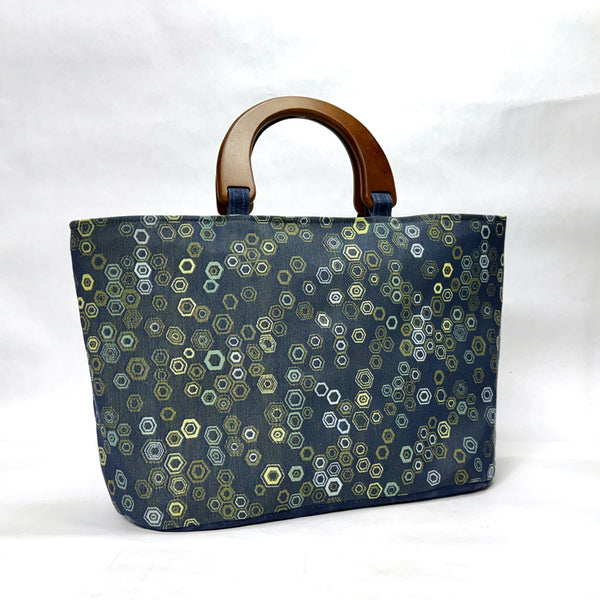 The bag is made with an upholstery weight Scattered Hexis design fabric in blue and has a heavy waxed canvas (water resistant) bottom. It is fully lined with a heavy cotton canvas. The bag has a layer of heavy interfacing which gives the bag added structure. There are 3 interior pockets to keep notions or other smaller items separate. The composite wooden handles give the bag some vintage vibe.