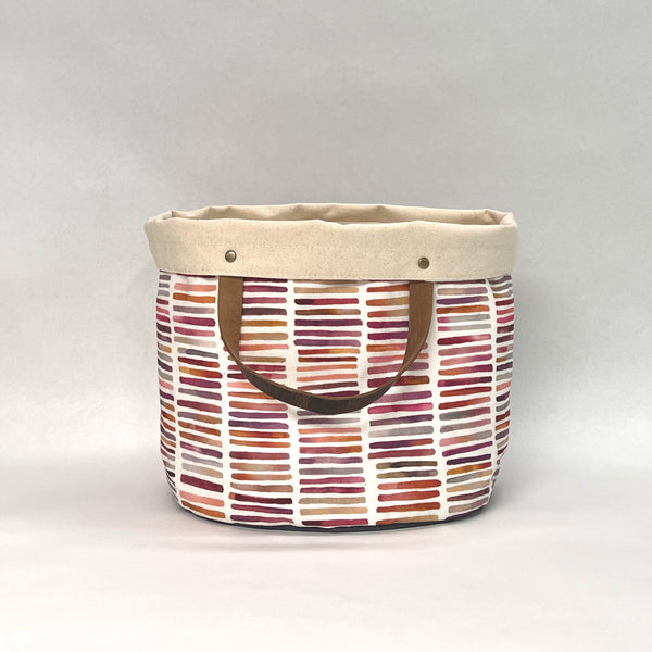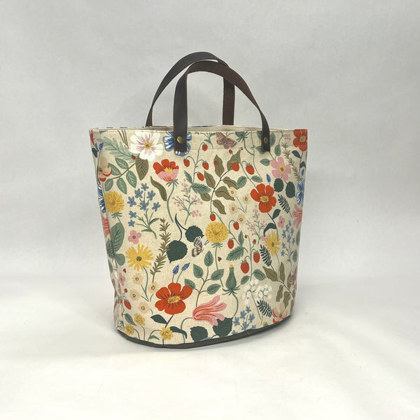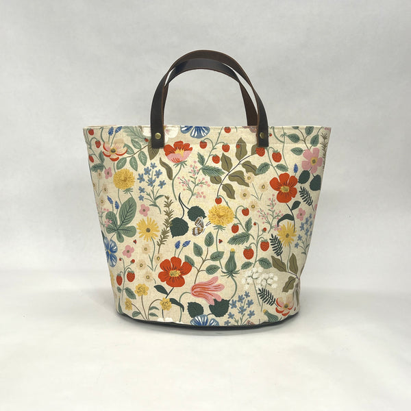 The bag is made with Rifle Paper's cotton/linen Strawbrry Fields print in natural and has a heavy waxed canvas (water resistant) bottom.  It is fully lined with a heavy cotton canvas. The bag has a layer of heavy interfacing which gives the bag structure. There are 2 interior pockets to keep notions or other smaller items separate.  The short leather handles completes the simplicity of the bag.