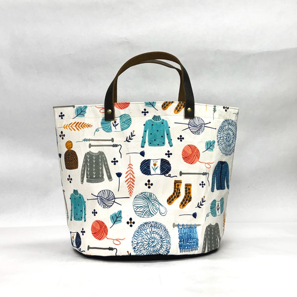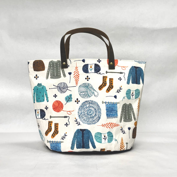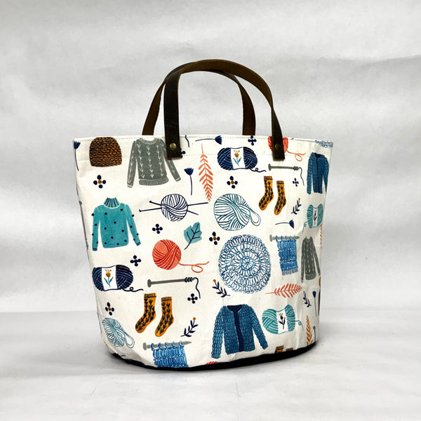 The bag is made with a medium weight cotton twill in Bianca Pozzi's We Love Yarn print and has a heavy waxed canvas (water resistant) bottom. It is fully lined with a heavy cotton canvas. The bag has a layer of heavy interfacing which gives the bag structure. There are 2 interior pockets to keep notions or other smaller items separate. The short leather handles completes the simplicity of the bag.